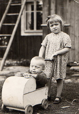 Juhani sai keksin, jotta hän suostuisi menemään rattaisiin kuvan ottamista varten. Anneli ei saanut keksiä ja ilme on sen mukainen. Kuvattu Salmelan portaiden edessä vuonna 1946.