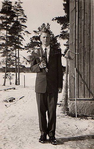 Jarkko Heinonen on päässyt ripiltä vuonna 1957. Kuvattu Pohjarannan torpan kulmalla.