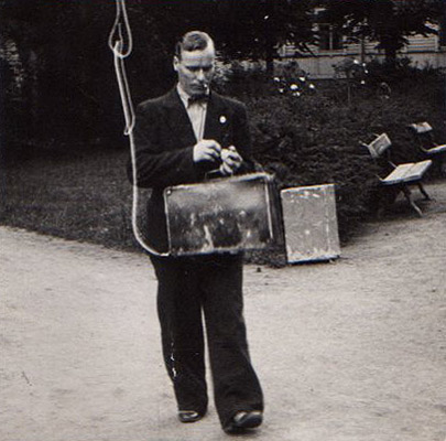 Yrjö Lehtilä työskenteli mm. merimiehenä ja tässä kuvassa hänet on kuvattu Turussa matkalaukkuineen meriltä lomille palatessaan vuonna 1945.