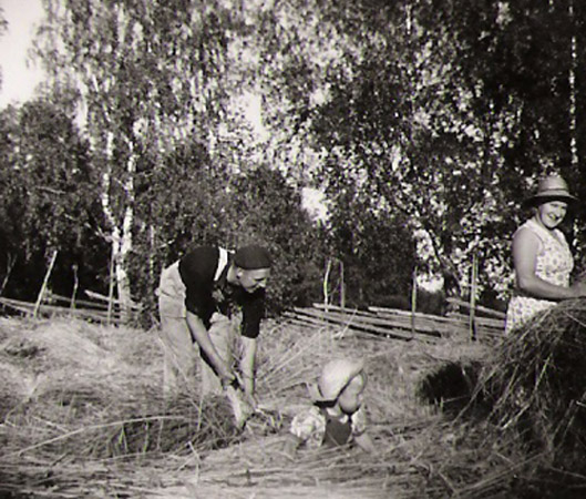 Rukiin leikkuuta Jaakkolan pellolla vuonna 1957. Kuvassa vasemmalta Armo Aaltonen, Pauli Aaltonen ja Helvi Aaltonen. Kuvan on ottanut Seija Suojanen.